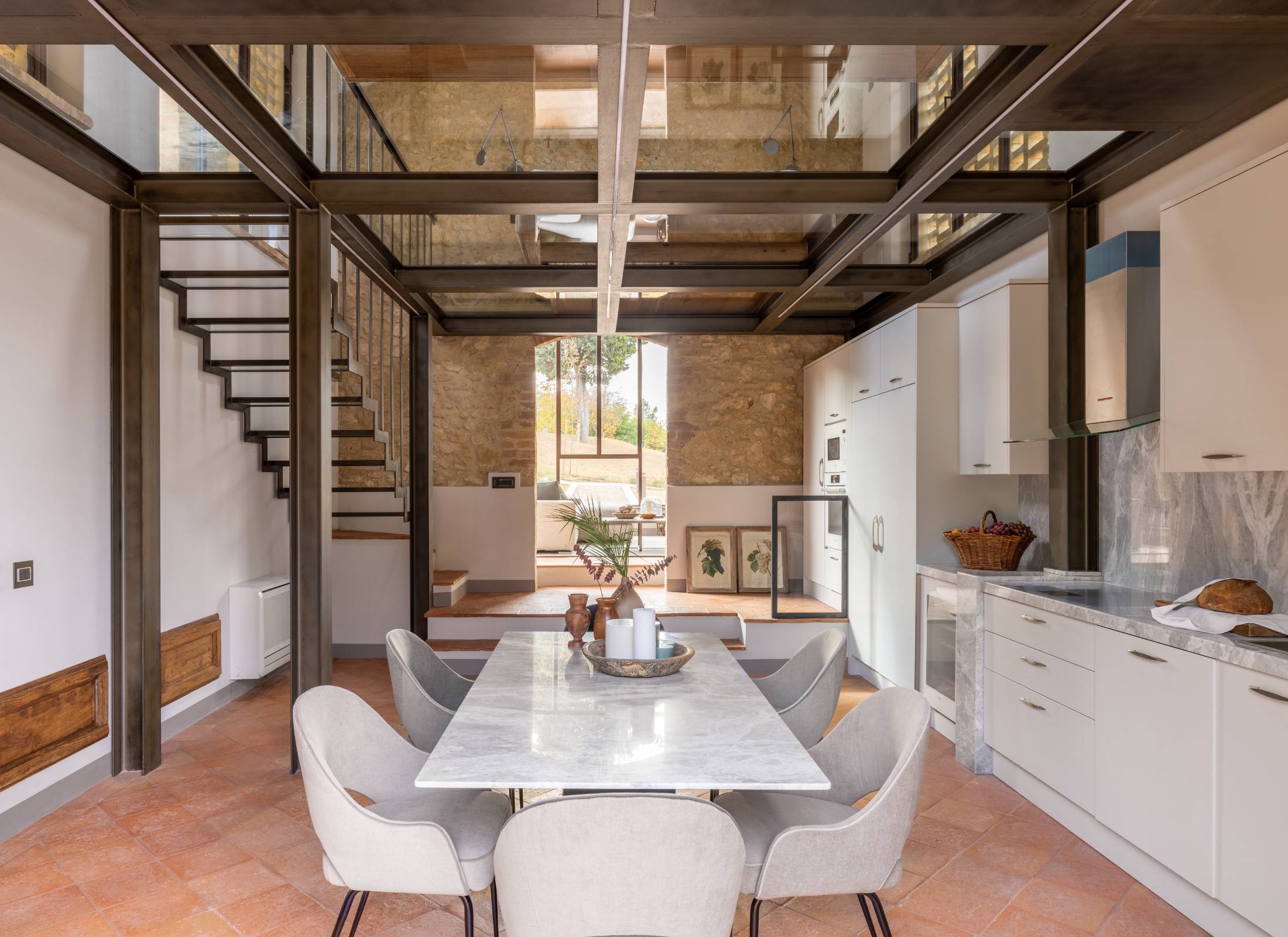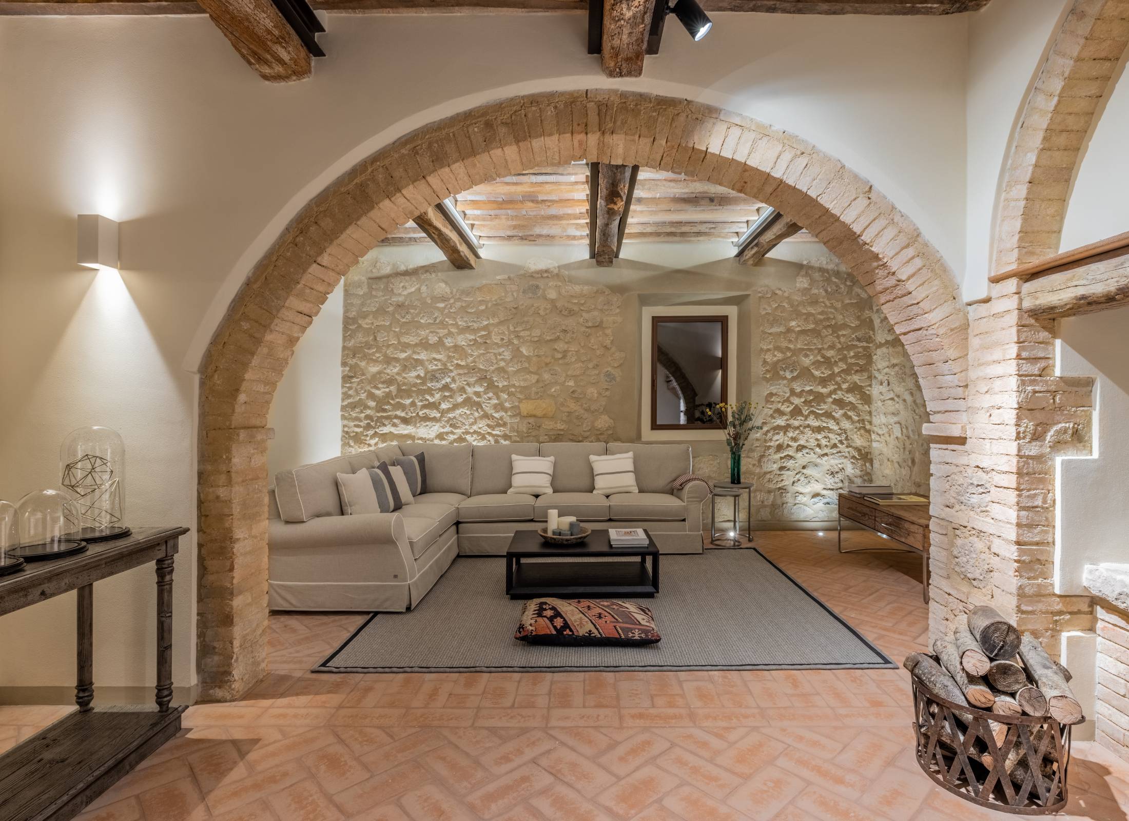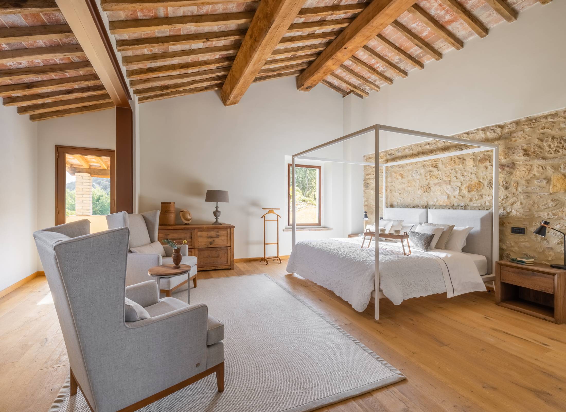 The living areas have been designed to create convivial spaces where guests can share special moments with family and friends. Armchairs and sofas share the space with sleek furniture with clean lines to create a striking contrast with the rustic wood beams and the red brickwork arches, particularly at sunset, when the golden rays stream through the large windows.