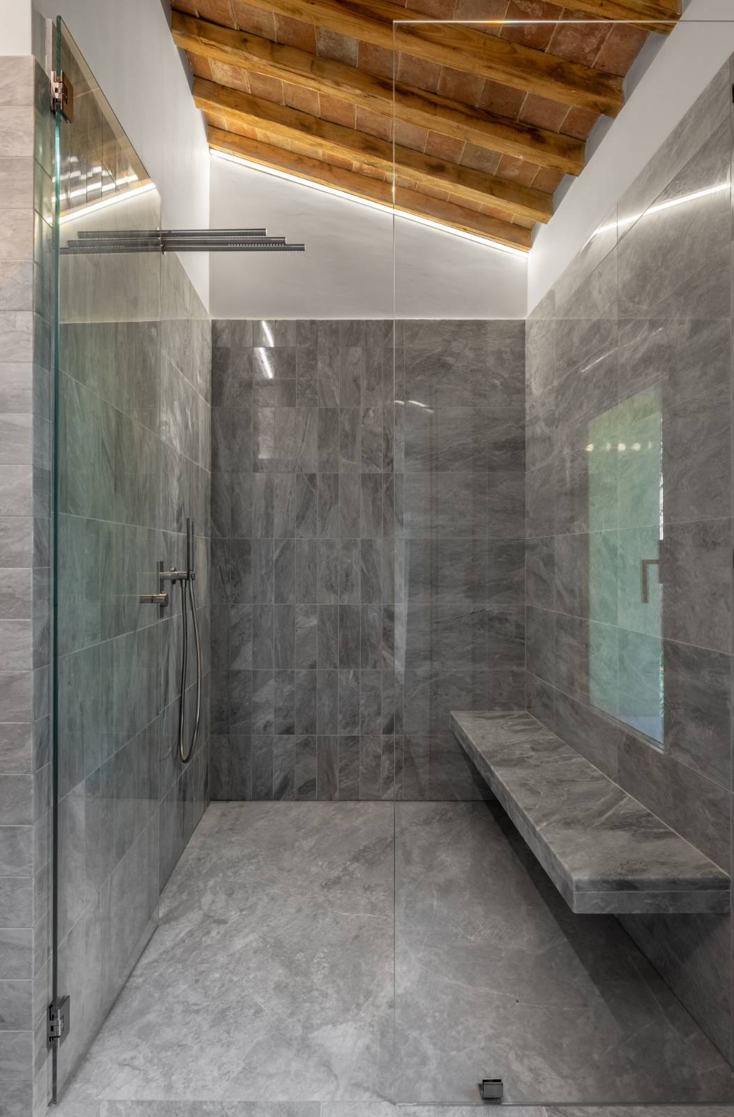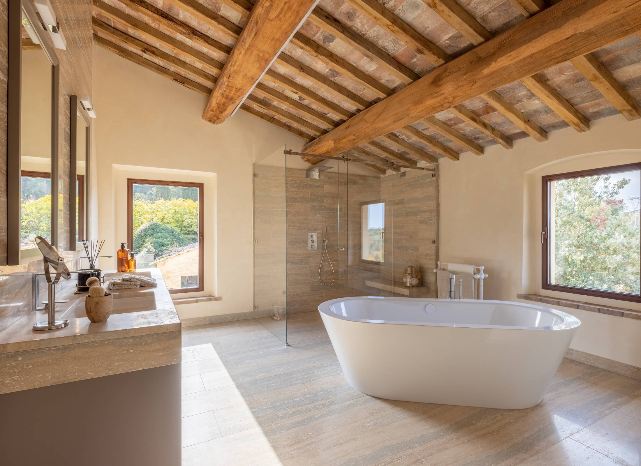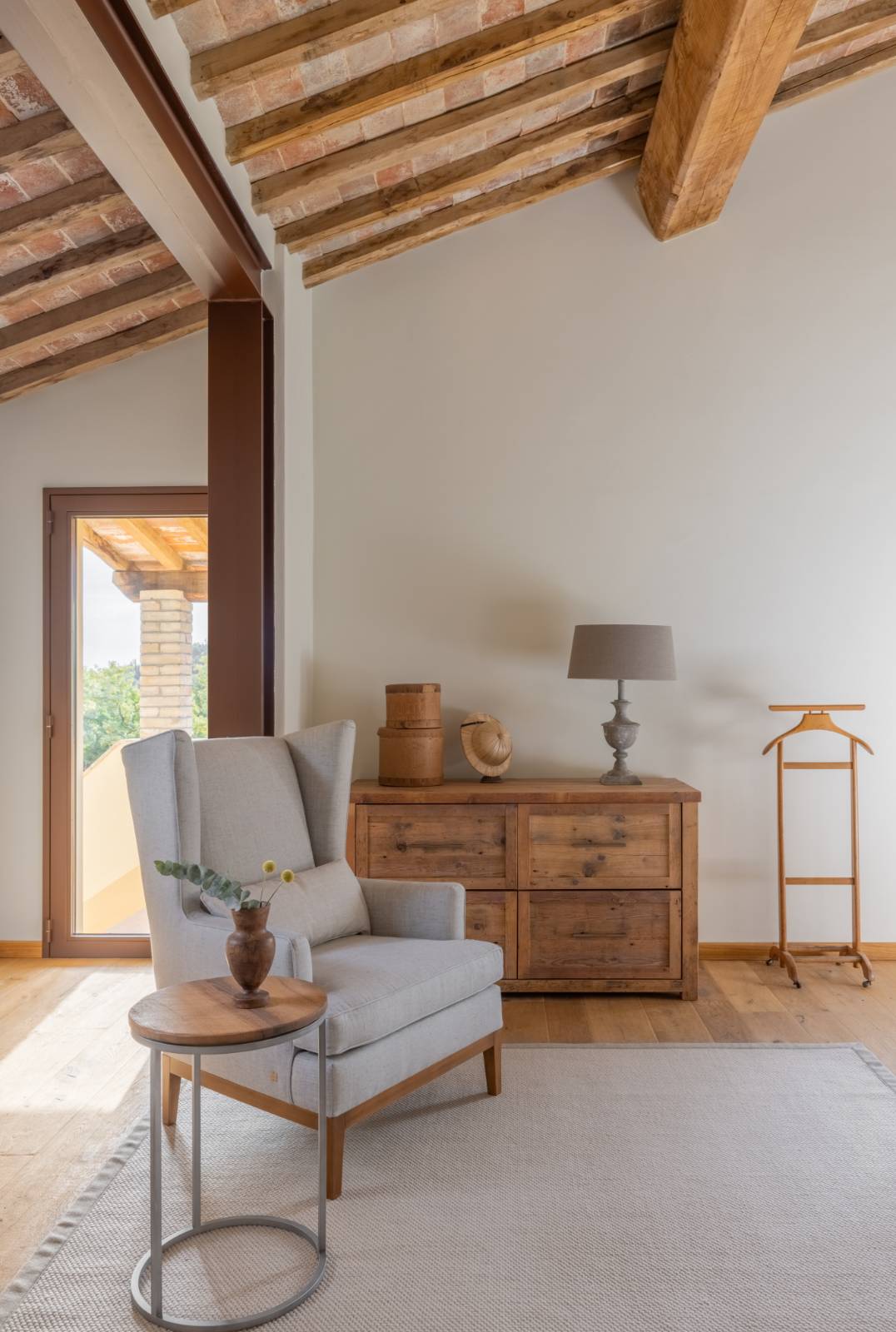 The living areas have been designed to create convivial spaces where guests can share special moments with family and friends. Armchairs and sofas share the space with sleek furniture with clean lines to create a striking contrast with the rustic wood beams and the red brickwork arches, particularly at sunset, when the golden rays stream through the large windows.
