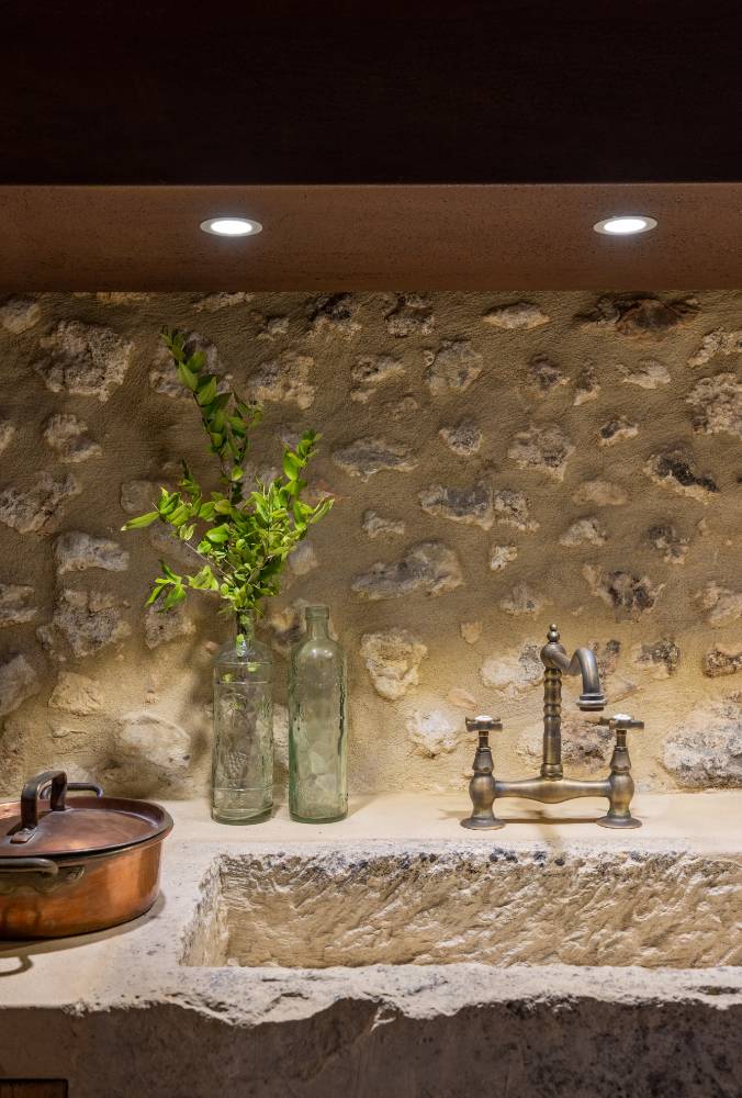Original floors and materials are reimagined, like the lamps made from old wine barrel rings, creating a sense of continuity between ancient and modern times.