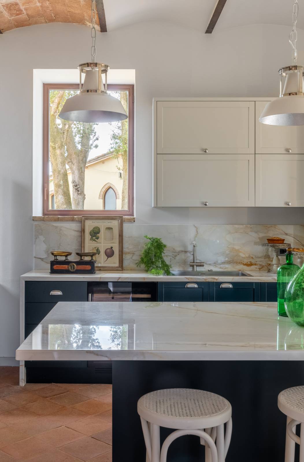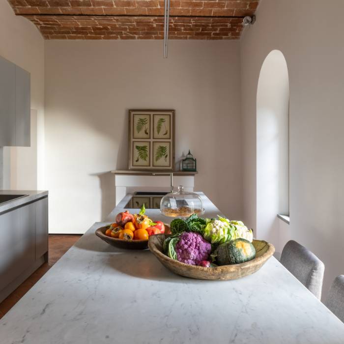 The kitchens feature beautiful cabinetry adorned with precious, luminous marble slabs. These are functional spaces designed to accommodate and serve a good number of guests.