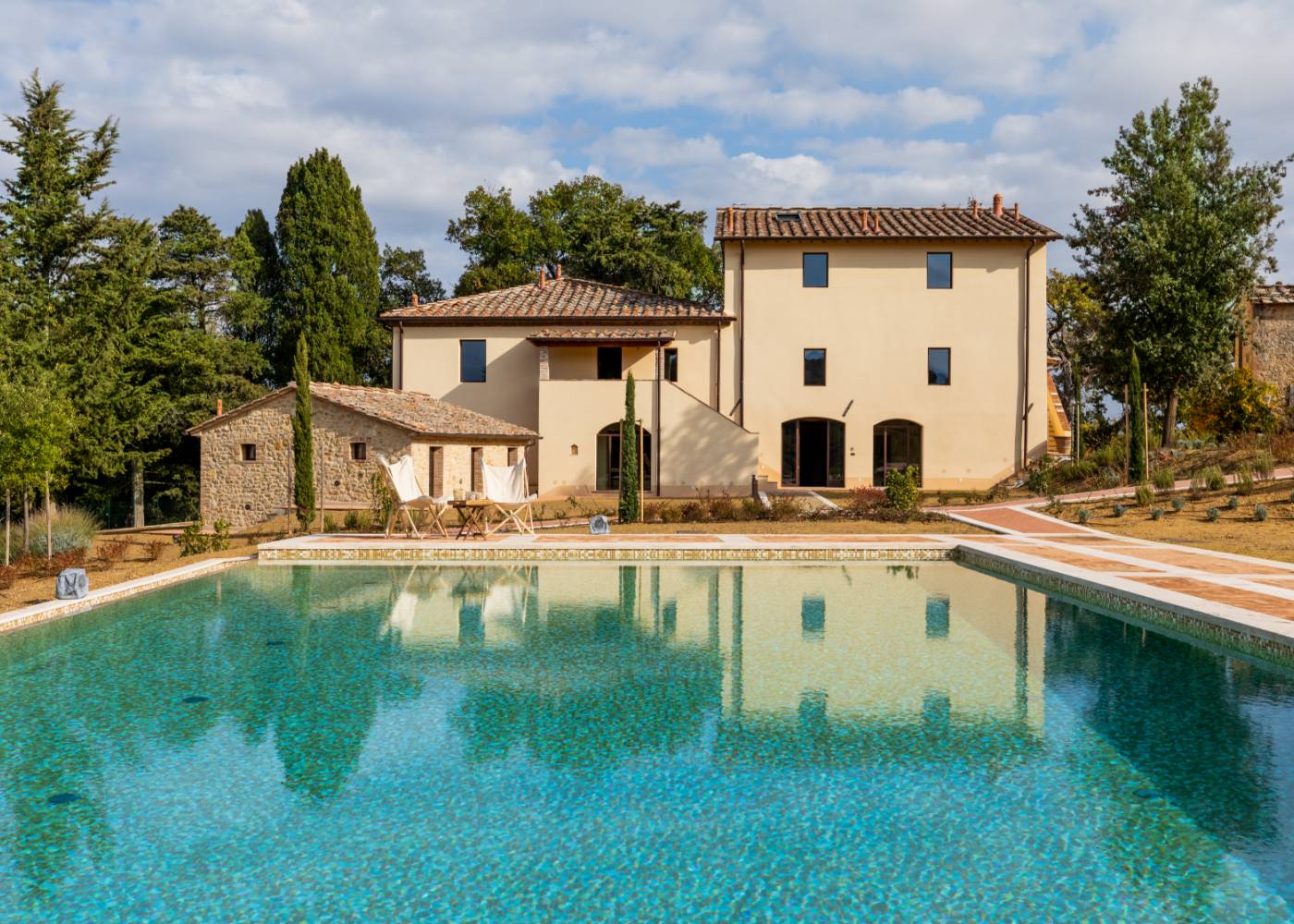 Through careful restoration, La Ripa, with its villas, swimming pools and 16th century gardens, is a jewel that has preserved the estate's original materials and layout to create a pleasant retreat surrounded by nature and the rich history of the area of San Gimignano.